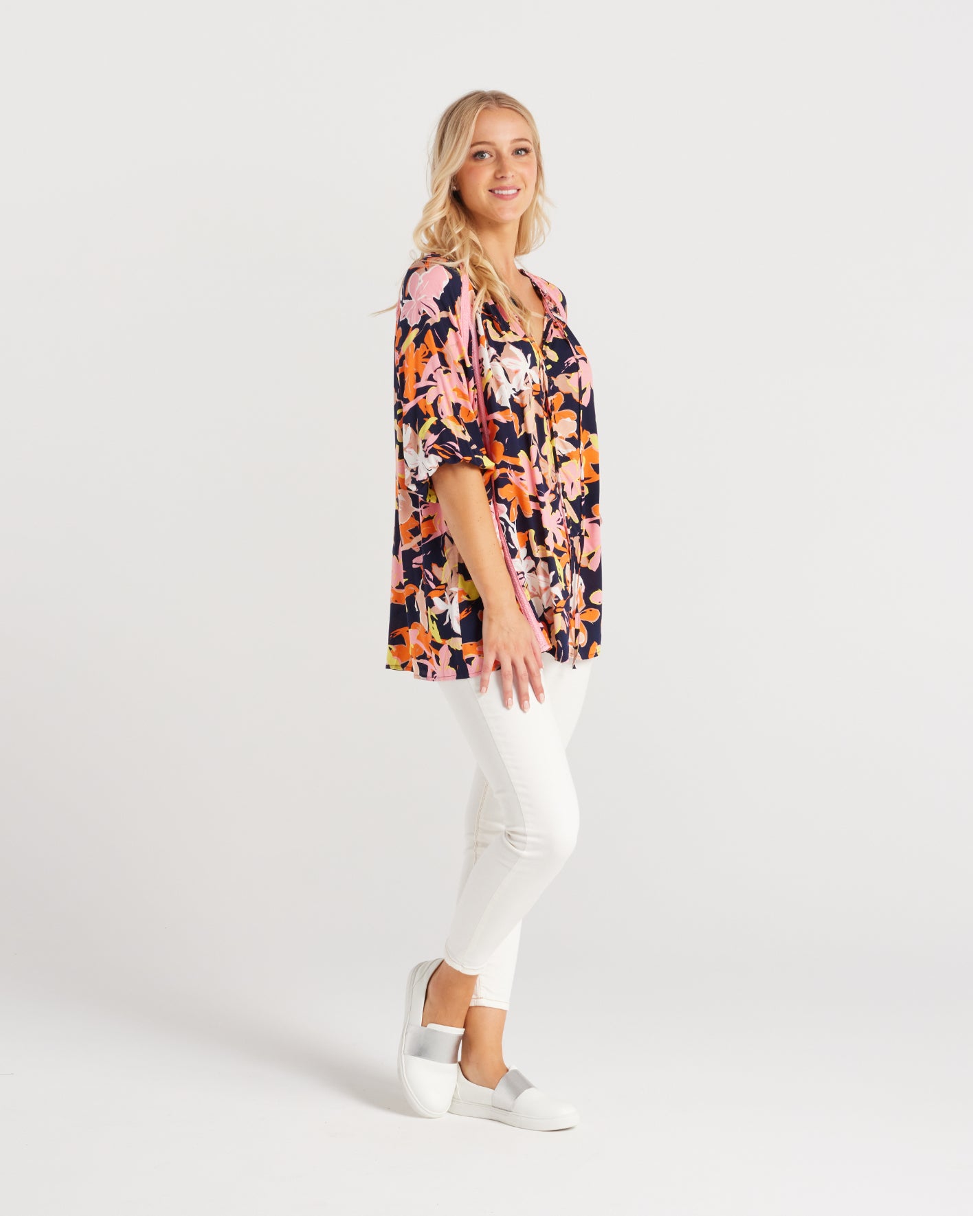 Vibrant fabric, this long-length top captivates with its neck ties, frill neck, button-up front, and elasticated sleeves, combining style and charm in one striking ensemble